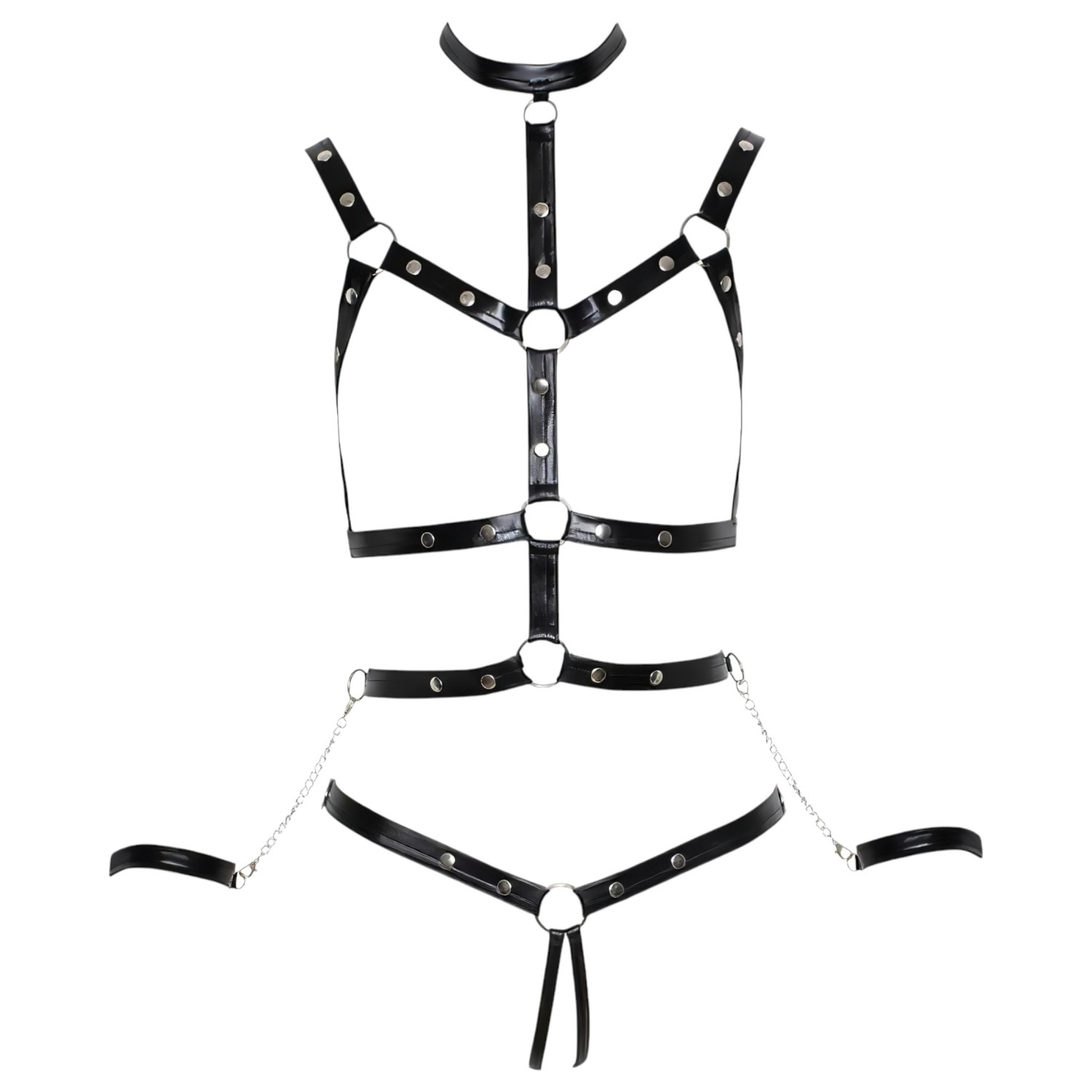 Löydä viettelyn ja sitomisen maailma tämän ainutlaatuisen, kaksiosaisen valjastyylisen bodyn avulla, jota koristavat näyttävät niitit.