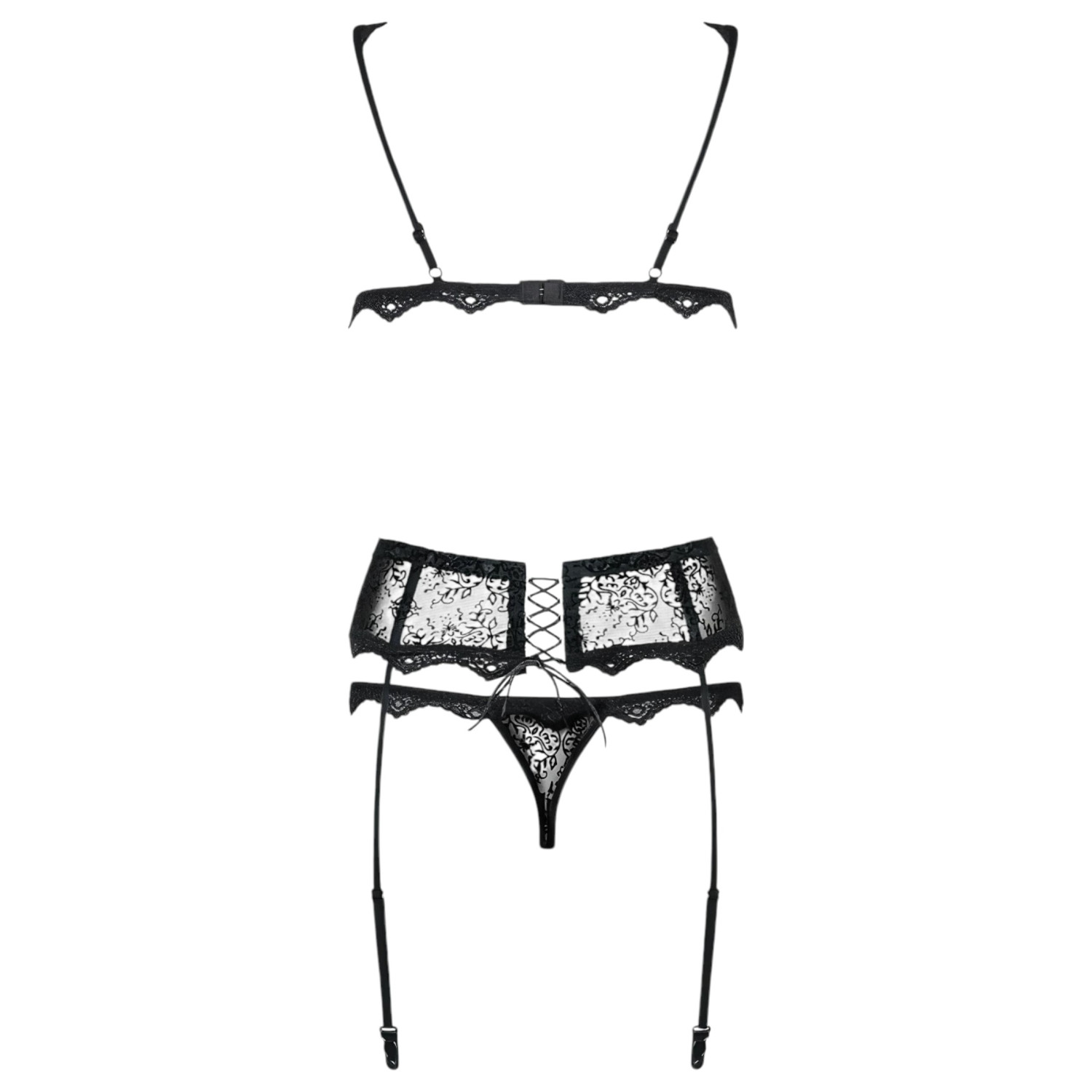 Kolmiosainen alusasusetti, joka on valmistettu kokonaan läpikuultavasta materiaalista ja koristeltu runsaasti pienillä kirjailuilla - täydellinen niille, jotka pitävät hienostuneen seksikkäästä tyylistä!