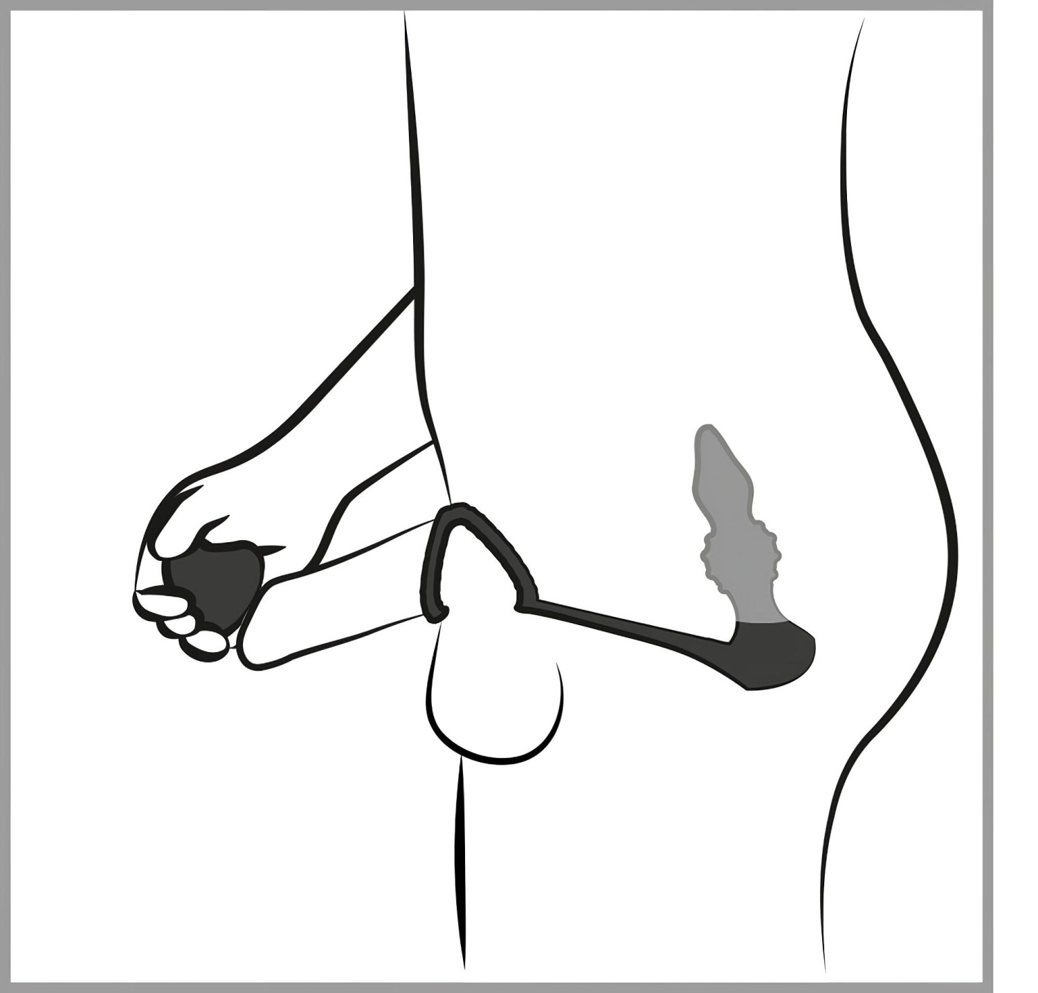 • Laita vähän liukkaria penikseesi ja pujota penisrengas puoliksi paikalleen puolijäykkänä tai kovana. Lisää sitten liukkaria anukseesi ja vibraattoriin. Kun olet valmis, työnnä vibraattori varovasti sisään (huomioi, että vibraattorin keskiosa on isompi ja erilainen tunnultaan) ja ohjaa toisella kädellä rengas peniksen juureen. Kivestenrengas menee kivesten taakse tuomaan lisää tukea.